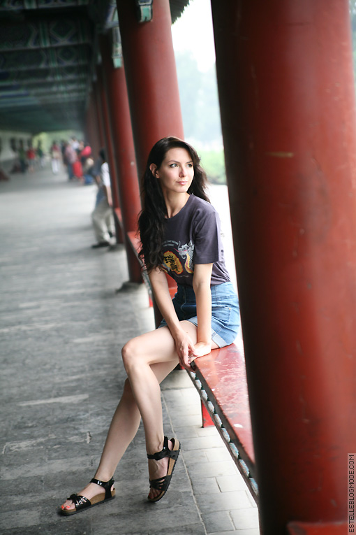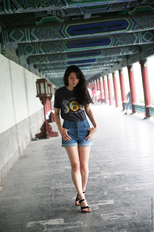 For the first time in the world, I reveal my hiking outfit for China : my high-waisted shorts that you know, a T-shirt found in Shanghai for the Asian style, and especially the most comfortable shoes in the world. No glam at all, but really comfortable for walking the miles of Chinese roads ! (and yes, fashion bloggers are not always modern fairiers wearing 12 cm heels ^^) However, I chose a model a little bit « girly » ! Hiker, but not too much! ^ ^ Kisses to all of you.