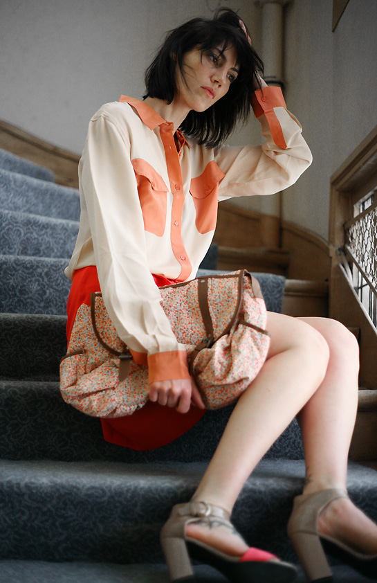 – la 2nde sur une harmonie pink (pêche et corail) autour d’une chemise en soie American Retro, d’une jupe effet portefeuille, une besace fleurie et de jolies sandales à talons bicolores !