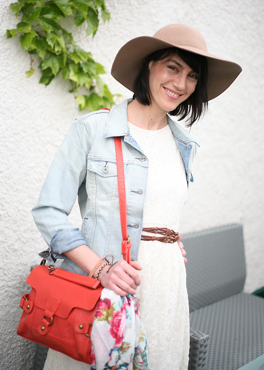 – la 1ère autour d’une ravissante robe en dentelle écru(qui fait une silhouette de déesse, je pense que je vais me l’acheter elle est tout simplement divine), que j’ai « déniaisé » avec un blouson en jean Levi’s un peu roots, d’adorables sandales salomés à paillettes (une tuerie absolue, pareil je craque et Angélique ne voulait plus les retirer !), un sac cartable corail et une capeline beige.