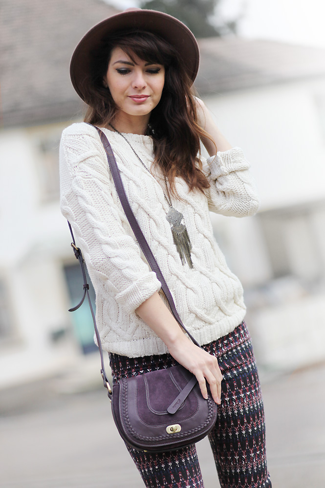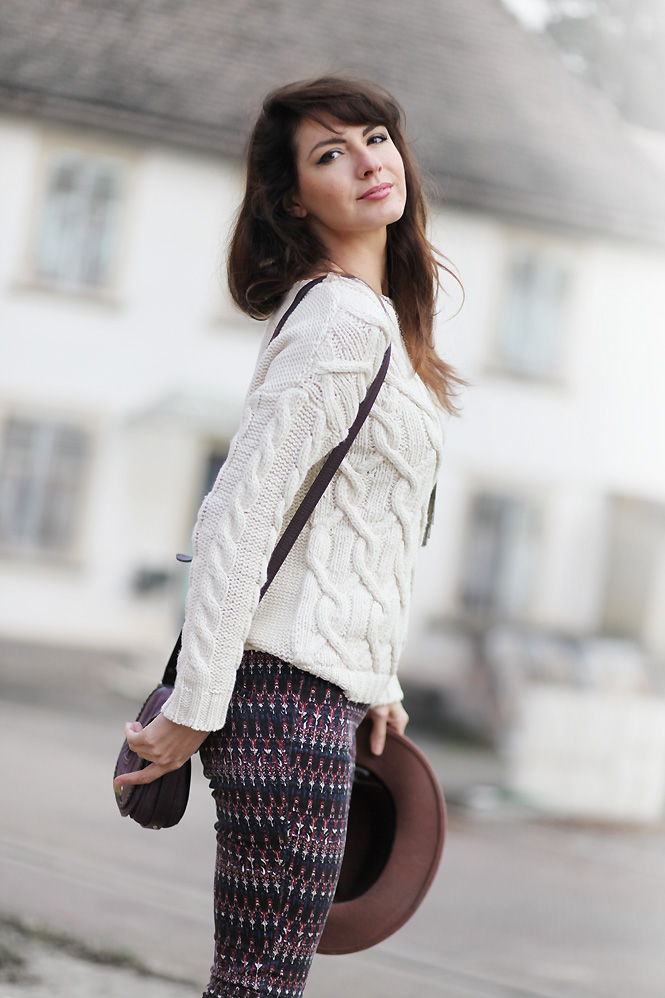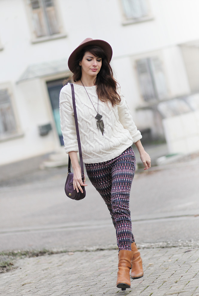 J’adore aussi ce genre de gros pull irlandais, c’est ma grande passion en hiver ! Géniale l’association avec ce pantalon imprimé style ethnique très tendance en ce moment, j’aime beaucoup cette tenue :)