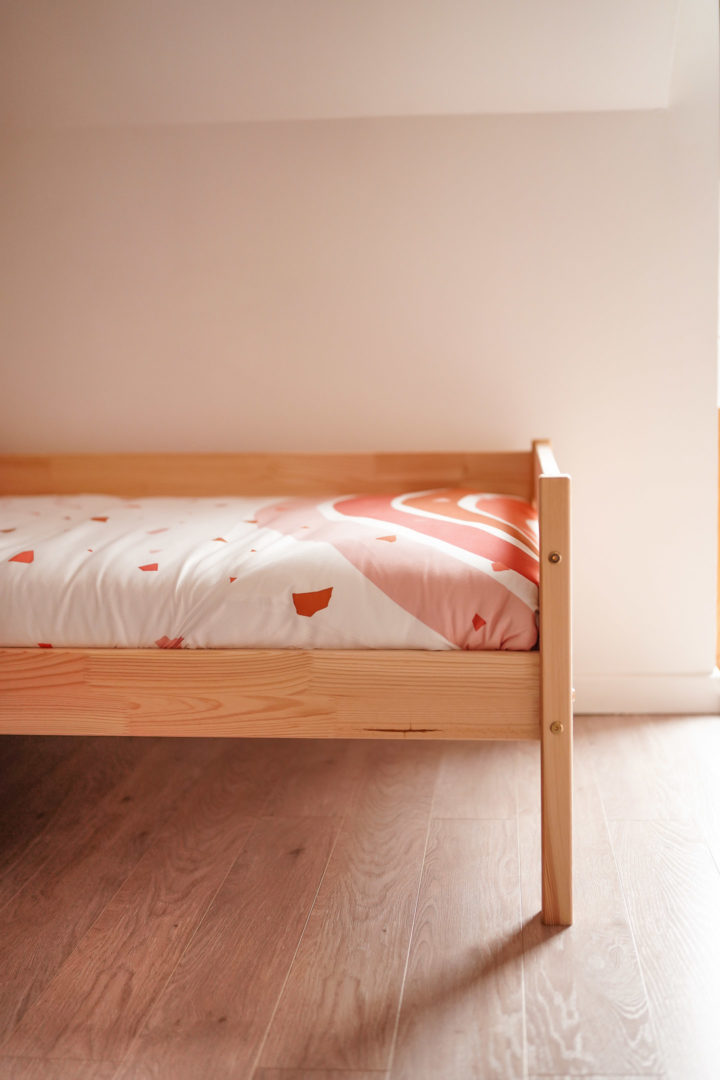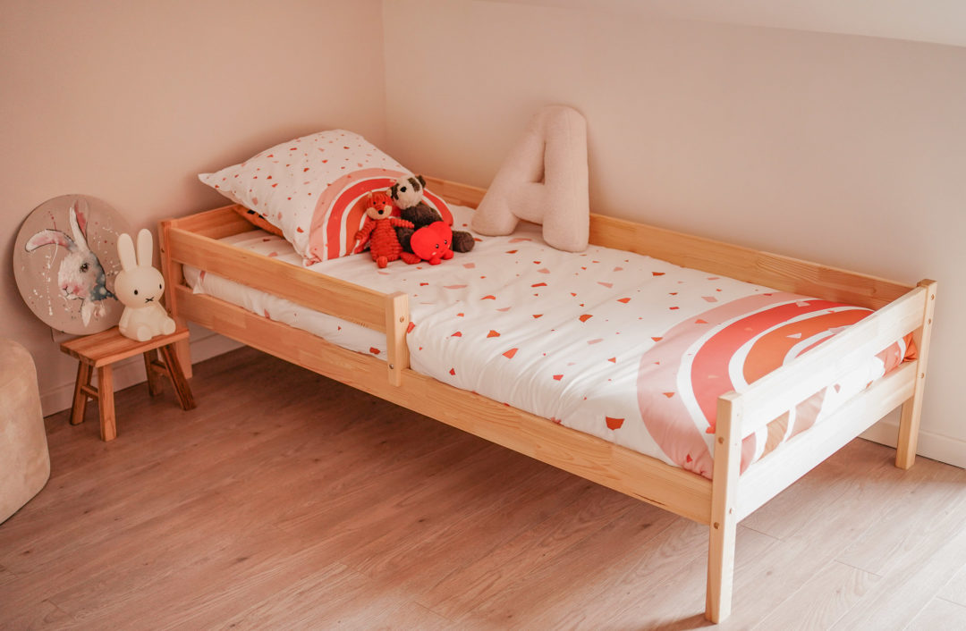 À 3 ans, et même si j’ai essayé de lui garder le plus longtemps possible son lit de bébé (on aimerait les garder bébé toute notre vie, n’est-ce pas ?), elle grandit à toute vitesse et pour sa sécurité et son confort, il fallait que je lui aménage enfin son espace avec son lit de grande : rassurant, confortable, joli et propice à un sommeil de vrai qualité.